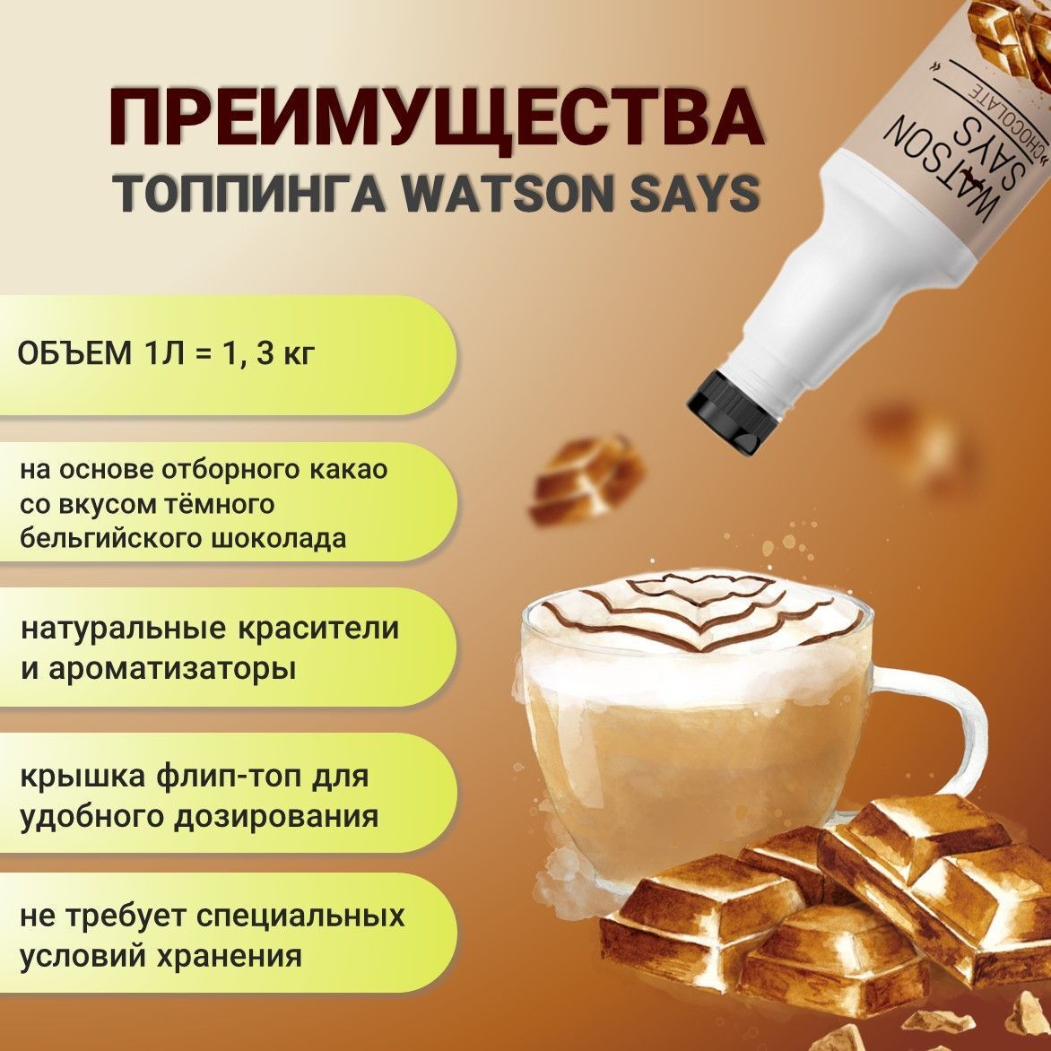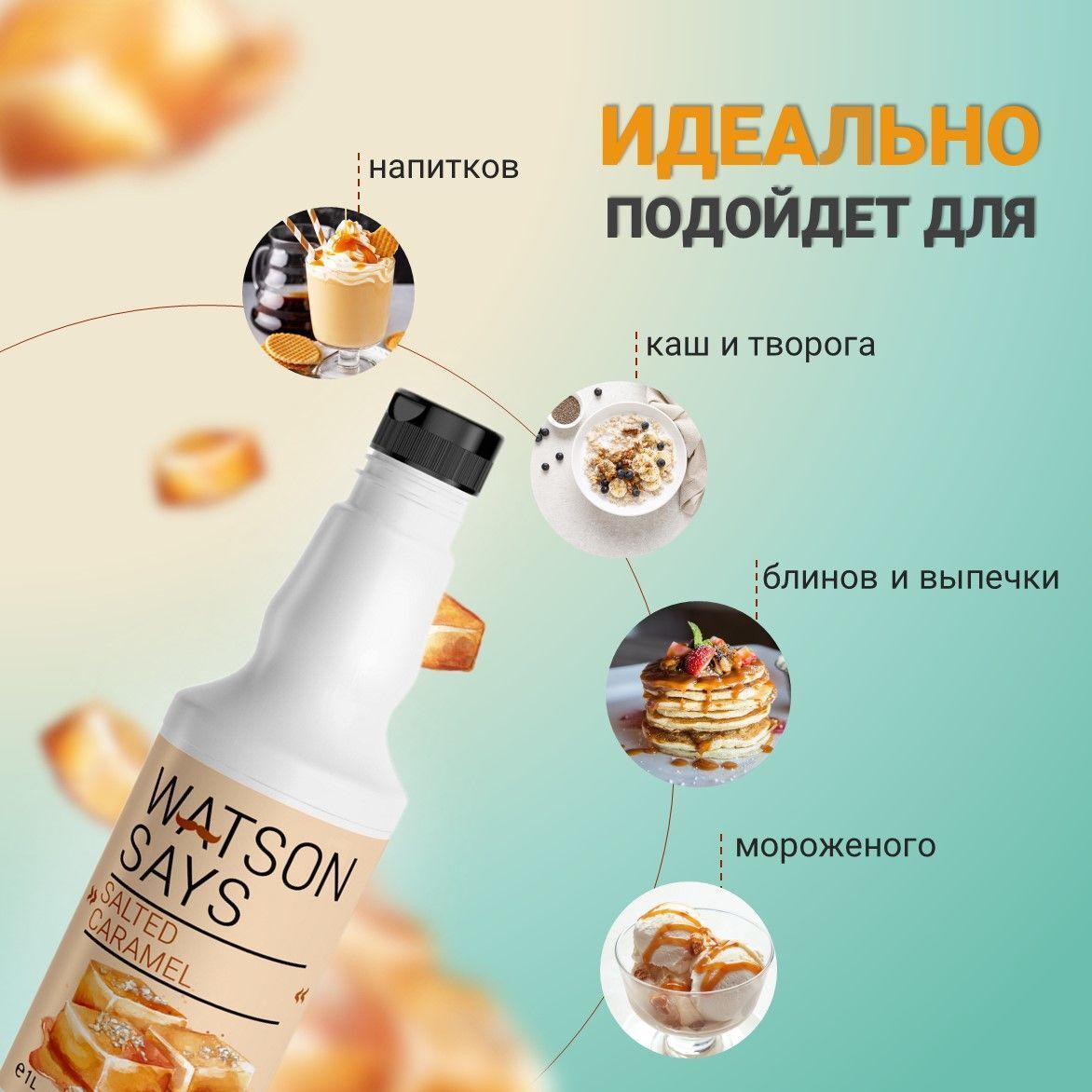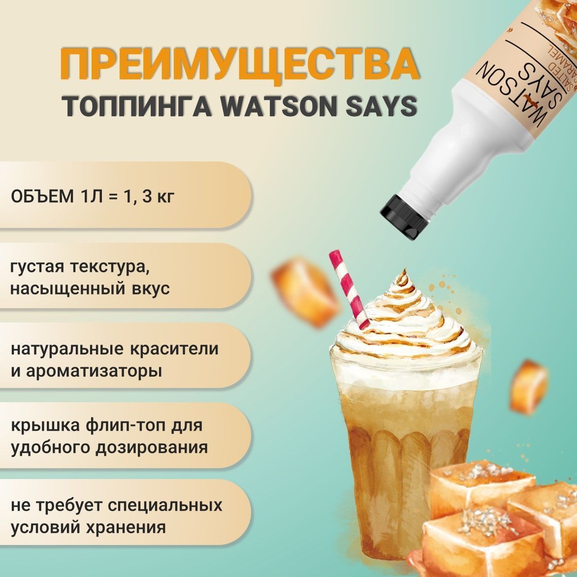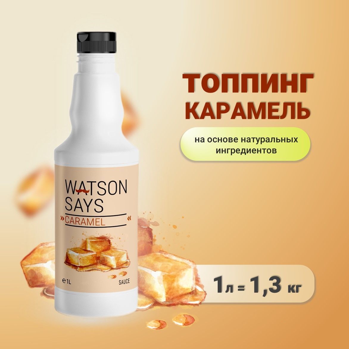 Топпинг Карамель WATSON SAYS, благодаря гладкой и плотной текстуре, прекрасно выглядит как на холодных, так и на тёплых продуктах. Подходит для декорирования мороженого, выпечки и десертов.